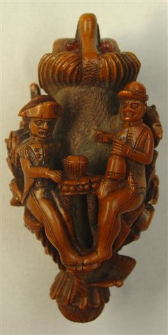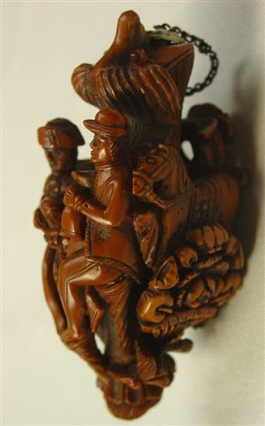 TABATIÈRE en noix de corozo, de forme ovoïde, à décor sculpté sur le thème de la chasse à courre: piqueux, cheval, selle, chien, trompe. UNe extrémité est orné d'une tête stylisée et de l'autre un portrait. Travail anglais? XVIIIe-XIXe. Haut. 7 cm.