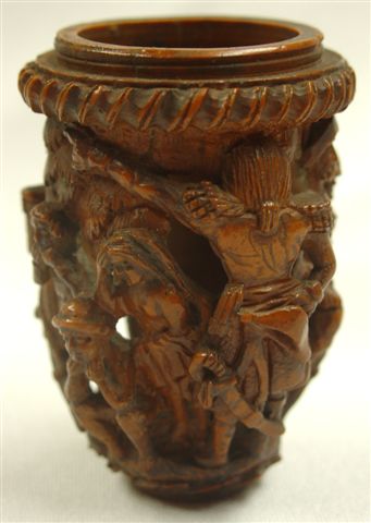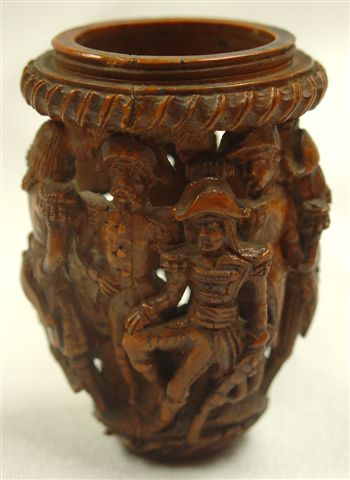 TABATIÈRE? en noix de corozo, de forme ovoïde, à décor sculpté et ajouré représentant Napoléon tournant le dos et montrant une direction, entouré d'officiers et soldats. Fin XVIIIe-début XIXe. Haut. 5 cm. Incomplet dont couvercle.