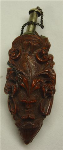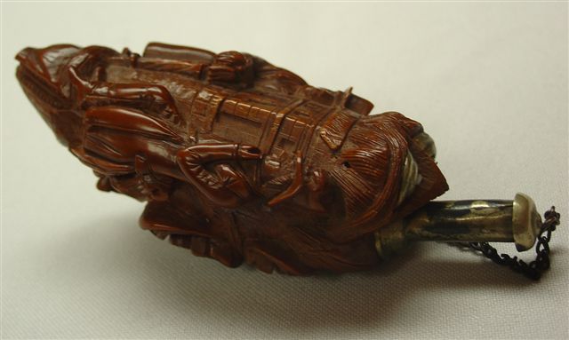 TABATIÈRE en noix de corozo, de forme ovoïde, à décor sculpté représentant deux hommes, l'un tenant un paraluie, l'autre une canne, tête stylisée et rinceaux. Travail anglais? XVIIIe-XIXe. Haut. 10 cm.