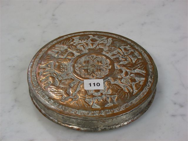 Joint BOÎTE ronde en métal à décor gravé et repoussé de scènes animées et animaux, travail oriental. Diam.18 cm.