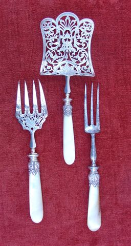 PELLE et FOURCHETTE à servir en argent. Spatule au riche décor ajouré. Manche nacre (accdt). Poinçon Minerve. Poids total 320 g. Joint FOURCHETTE à découper en acier, virole en argent et manche en nacre.