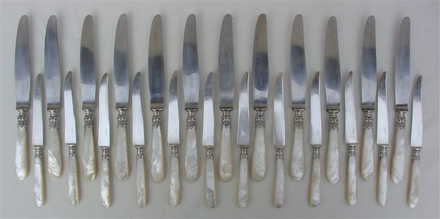 12 COUTEAUX de table et 12 COUTEAUX à dessert, lame en métal argenté, virole en argent et manche en nacre. Ecrin.