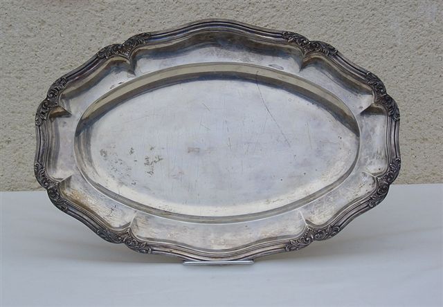PLAT EN ARGENT de forme ovale, à huit contours, bordure de filets et agraffes feuillagées, de style Louis XV. XIXème. Poinçon Minerve. Poids: 969 g.