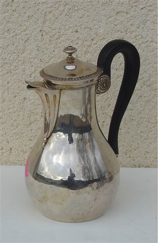 VERSEUSE en argent, section circulaire présentant un fond plat. L'encolure se relève à l'avant pour former le bec couvert, lequel est agrémenté à sa partie inférieure de canaux. Le couvercle, monté à charnière, est bordé d'une bande de feuilles d'eau ; bouton central en forme de toupie. L'anse, en bois noirci, est maintenu par une hotte à décor de fleurs. Poinçon Vieillard (1819-1838). Haut. 20 cm. Poids: 465 g.