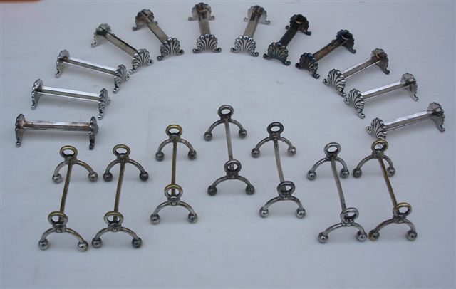 12 PORTE-COUTEAUX en métal argenté à décor de coquilles. Joint 7 PORTE-COUTEAUX en métal argenté ornés de boules et fleurettes.