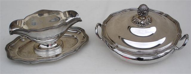 LÉGUMIER et SAUCIÈRE en métal argenté. Couvercle à décor de pomme de pin et feuillage. Maillechort. Diam. 24 cm.