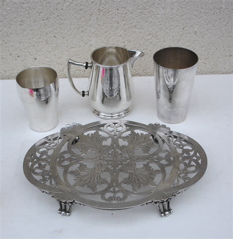 Lot de métal argenté: DESSOUS de PLAT à décor de fleurs de lys et feuillage ajourés, Maison Cailar Bayard ; PICHET ; 2 grands GOBELETS. Haut. 14,5 cm.