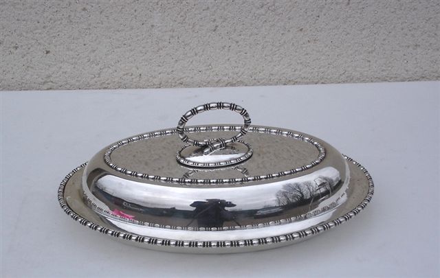 PLAT couvert en métal argenté et son réceptable en céramique blanche avec marque "Carlton Ware". Angleterre. Long. 34 cm. Poids 1355 g. (sans réceptacle).