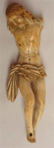 CHRIST en croix (manque les bras et deux doigts des pieds). Ivoire patiné. XVIIème. Haut. 14,5 cm.