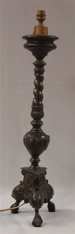 PIQUE CIERGE en bronze à patine brune à décor de torsade et têtes d'angelots. Piètement tripode terminé en griffes d'aigle. Electrifié. Haut. 66 cm.