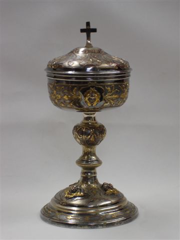 CIBOIRE à décor de têtes d'angelots. Le corps supérieur est en argent et vermeil, poinçon au 1er Coq (1799-1809). Le fût et la base sont en bronze argenté et doré. Poids total: 380 g. Haut. 20 cm.
