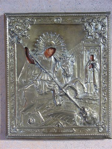 SAINT GEORGES luttant contre le dragon. Panneau en métal doré...