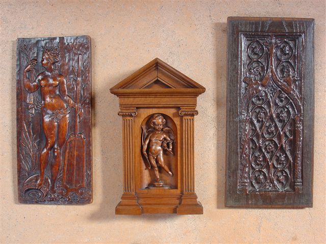 2 PANNEAUX en bois naturel sculpté: fenestrage dit "à orbevoie" dans le style gothique ; Cérès, travail de style. Haut. 44 cm. Joint CUPIDON au temple, armé de son arc et de la foudre, en bois naturel sculpté. Travail de style. Haut. 34 cm.