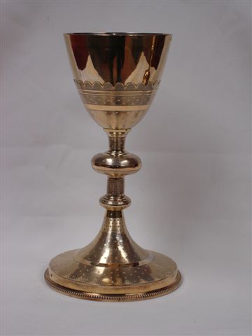CALICE en vermeil à décor de points et de rainures. Inscription "E. RAVEAU 1902" Poinçon Minerve. Poids 340 g. Haut. 22 cm.