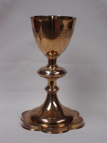 CALICE en vermeil à décor de fleurs et feuillage stylisés. Inscription latine sur la timbale "Hia est enim sancuis meus novi testamenti". Marque orfèvre "A. CHERTIER Paris". Poinçon Minerve. Poids 305 g. Haut. 21,5 cm.