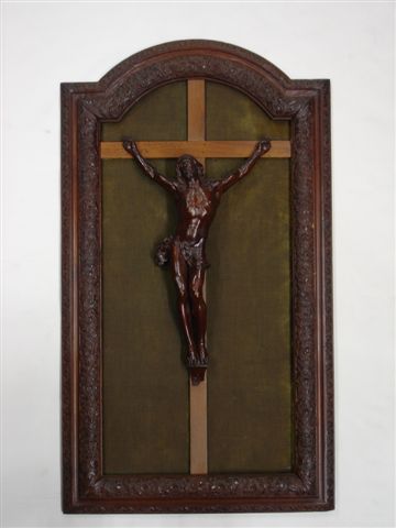 CHRIST en croix. Exceptionnel CADRE en bois naturel de Sainte Lucie, dit de BAGARD richement sculpté. Travail lorrain, Louis XIV, fin XVIIème-début XVIIIème. Haut. 81, Larg. 45 cm.