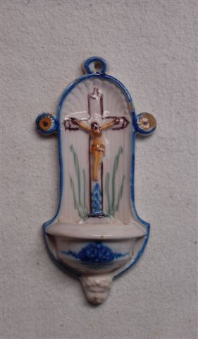 SAMADET. BÉNITIER en faïence polychrome de grand feu à décor en relief d'une crucifixion, d'une coquille et d'un angelot à l'aplomb. Haut. 20,7 cm