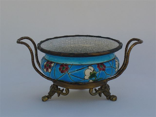 Petite JARDINIÈRE monture tripode à anses en laiton façon bambou. Décor plein d'un semis de fleurettes blanches et rouges sur fond bleu.
