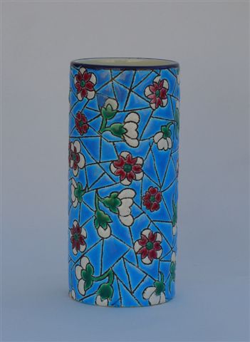 VASE rouleau. Décor plein d'un semis de fleurettes blanches et rouges sur fond bleu.
