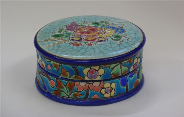 PILULIER. Couvercle à décor d'un bouquet fleuri sur fond bleu céruléen craquelé. Ceinture fleurie sur fond bleu (n°5670).