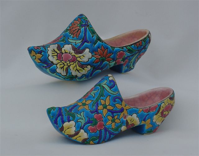 Paire de SABOTS. Décor chrysanthémo paéonien sur fond bleu (n°792). Intérieur rose craquelé.