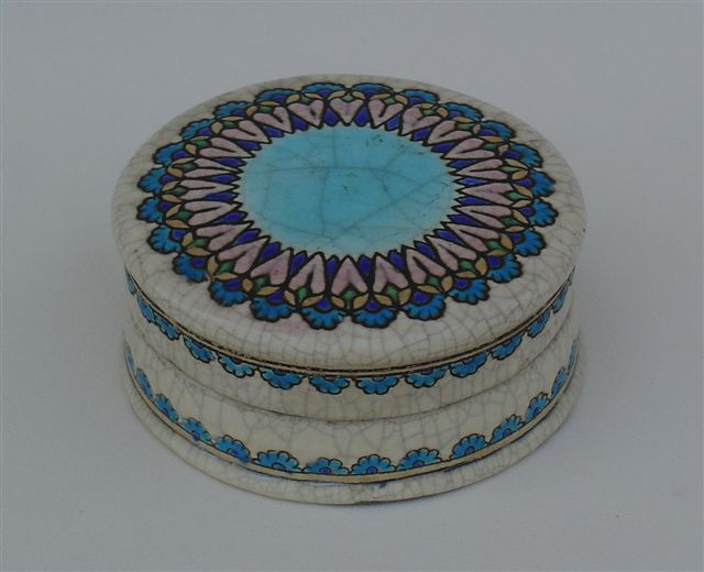 PILULIER. Décor rayonnant stylisé à centre bleu céruléen sur fond crème craquelé.