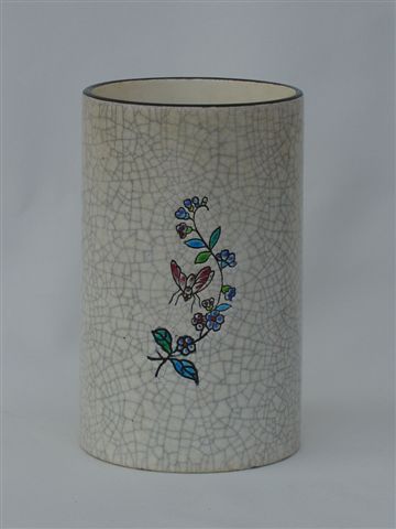 VASE rouleau. Décor d'un oiseau polychrome branché sur fond crème craquelé (D 49 manuscrit).