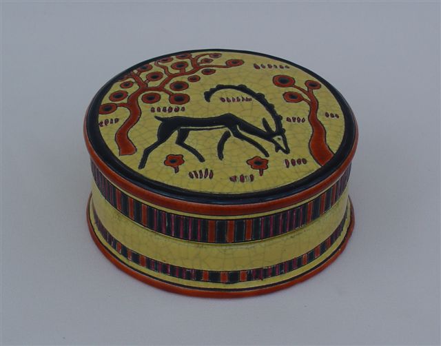 PILULIER. Décor en noir d'un cervidé stylisé broutant sur fond jaune craquelé, filets et rayures caramel, roses et noirs alternés.