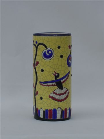 VASE rouleau. Décor d'oiseaux stylisés émaillés noir, bleu foncé, et bordeaux, volant sous des arbres sur fond jaune craquelé.