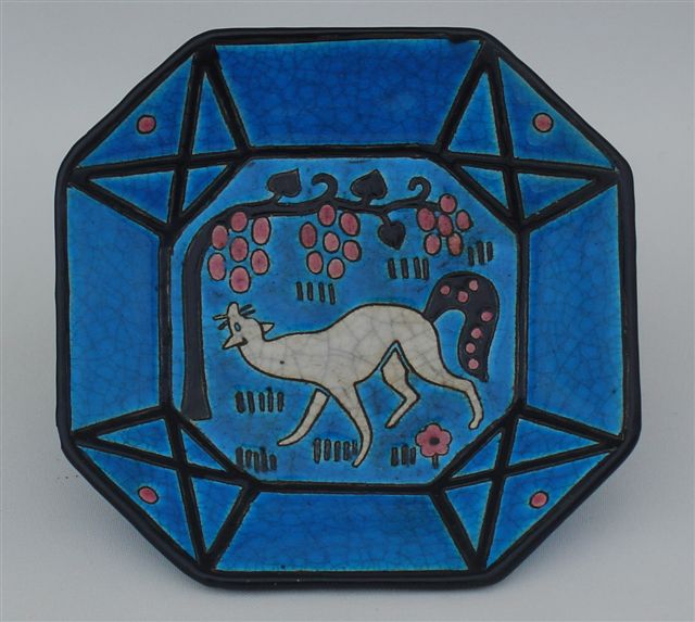 CENDRIER. Décor géométrisant d'un renard aux raisins sur fond bleu. Pans à encadrements émaillés noir orné de croix dans les angles.