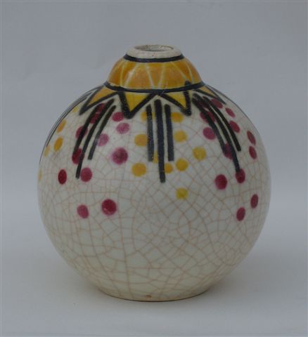 VASE boule. Décor stylisé rayonnant, partant du col, d'une étoile, de rayures et de pois en noir, jaune et bordeaux, au pochoir, sur fond crème craquelé.