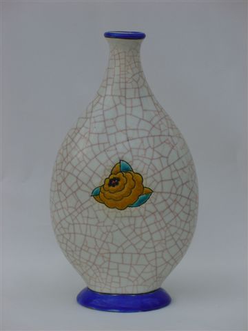 VASE ovoïde à panse aplatie. Décor de fleurs et d'un papillon stylisés sur fond crème craquelé. Talon et col à bordure bleue. Marque manuscrite D 5072.