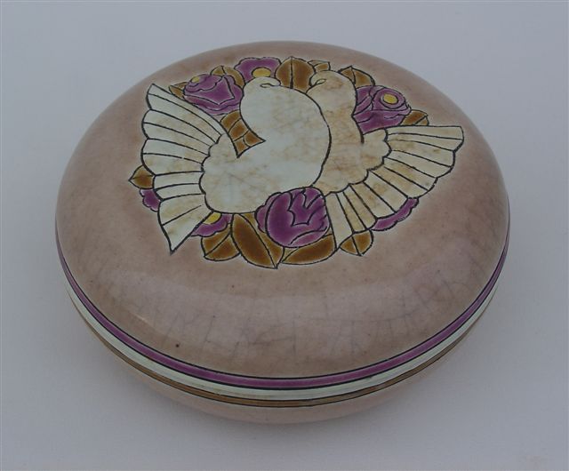 BONBONNIÈRE ronde. Décor stylisé aux deux colombes entourées de roses sur fond vieux rose craquelé. Marque manuscrite D 855 et en creux 1163.