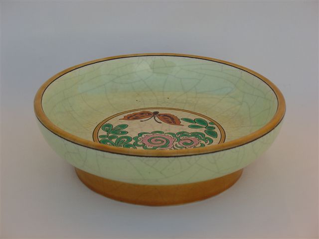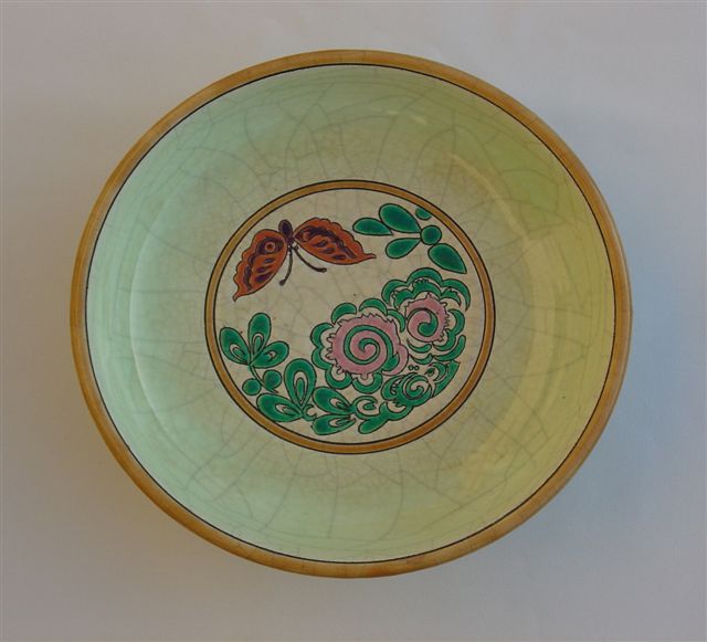 COUPE. Décor central au papillon brun deux tons sur émail crème craquelé. Fond et revers vert clair. Talon et bordure jaune safran. Marque manuscrite D 4062.
