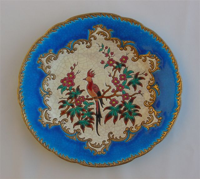ASSIETTE. Décor en réserve d'un perroquet à la branche fleurie sur fonds crème craquelé. Aile à fond bleu. Rehauts d'or en volutes encadrant de cartouche et en bordure. Revers bleu céruléen. Marque manuscrite D 38 et F 2 dans un cadre rectangulaire.