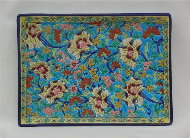 PLATEAU rectangulaire en creux. Décor chrysanthémo paéonien sur fond bleu (D 792).