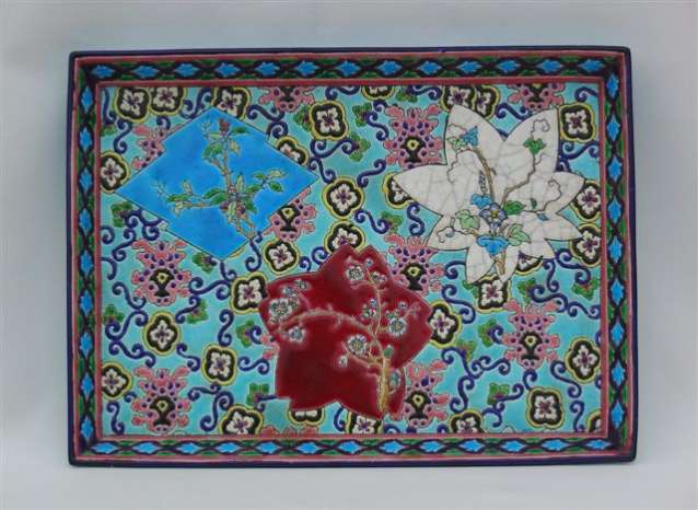 PLATEAU creux rectangulaire. Décor japonisant sur fond bleu céruléen. Décor de trois cartels à fond bleu, pourpre et blanc représentant des fleurs sur tiges.