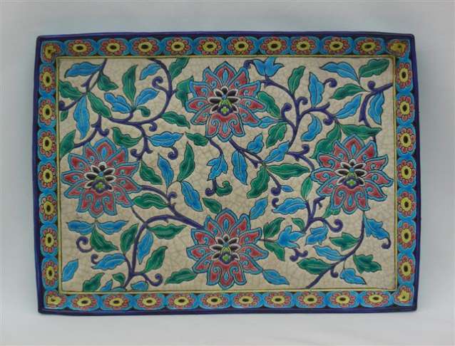 PLATEAU rectangulaire à bords relevés. Décor de quatre fleurs stylisées sur fond blanc craquelé. Bordure de fleurs juxtaposées.