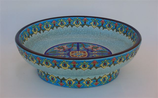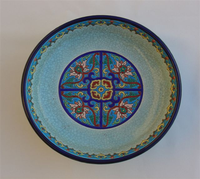 COUPE sur piédouche. Décor central rayonnant de frettes et de fleurs de lotus stylisées d'inspiration chinoise sur fond bleu ceruléen craquelé.