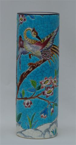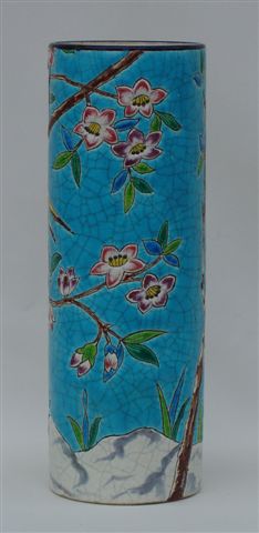VASE rouleau. Décor à l'oiseau dans des branchages fleuri sur fond bleu craquelé (D 488 manuscrit).