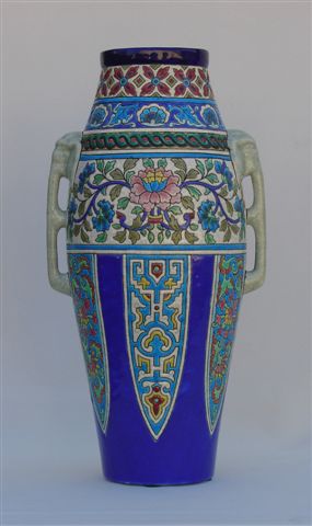 VASE, anses latérales aux éléphants vert clair. Décor en bandeaux sur fond blanc craquelé et bleu dans la partie supérieure. Alternance de motifs géométriques dans des encadrements de forme ogivale renversée dans la partie inférieure, sur fond bleu.