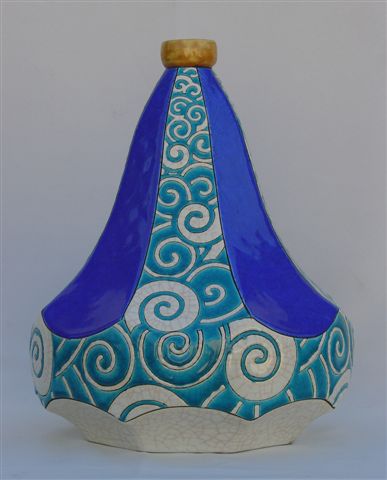 VASE TOUPIE à à huit facettes. Décor de larges volutes stylisées verte alternées sur fond beige craquelé. Quatre faces à fond bleu. Col émaillé jaune safran. Décor D 50564 manuscrit