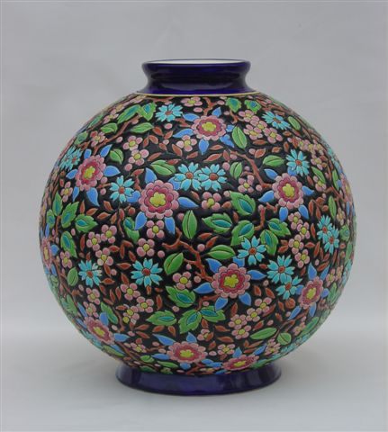 VASE boule (F 3168 manuscrit). Décor de fleurs polychromes sur fond noir (D 5669 manuscrit). Col et talon émaillés bleu de Sèvres.
