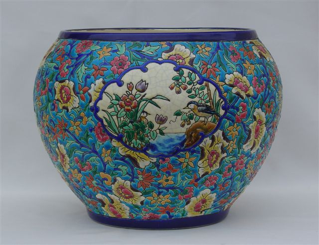 CACHE-POT. Décor en réserve d'un oiseau sur une rive fleurie. Décor chrysanthémo paéonien sur fond bleu céruléen (D 792). Bordure et talon "bleu de Sèvres".