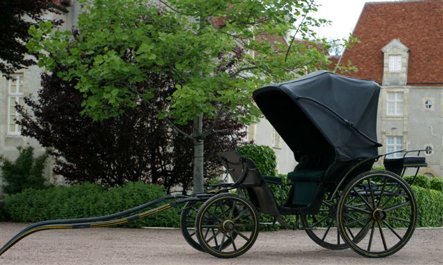 DUC. Caisse carrée. Grand garde-crotte et ailes en bois. Banquette capitonnée de drap bleu, capote en cuir à compas cintrés. Banquette arrière pour groom, à l'anglaise à jupe en bois sur ferrures. Avant-train à rond simple, selette et lisoir cintrés, ressorts à pincettes à mains à l'anglaise. Arrière-train à ressorts à pincettes à mains à l'anglaise, sur moutonnets en fer. Roues à bandage en caoutchouc. Frein à manivelle. Paire de brancards. Garniture capitonnée d'origine en drap. Peintures refaites bleu à filets jaunes. Accidents à la garniture. Bon état. Restauré.