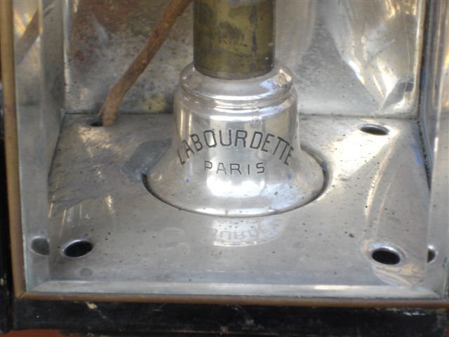 Une LANTERNE de chez LABOURDETTE, en tôle peinte et cuivre argenté, de forme carrée. Ouverture arrière. Cheminée à chapeau et timbre ronds. Verres biseautés. Intérieur en cuivre argenté, douille de bougie fixe (électrifiée).