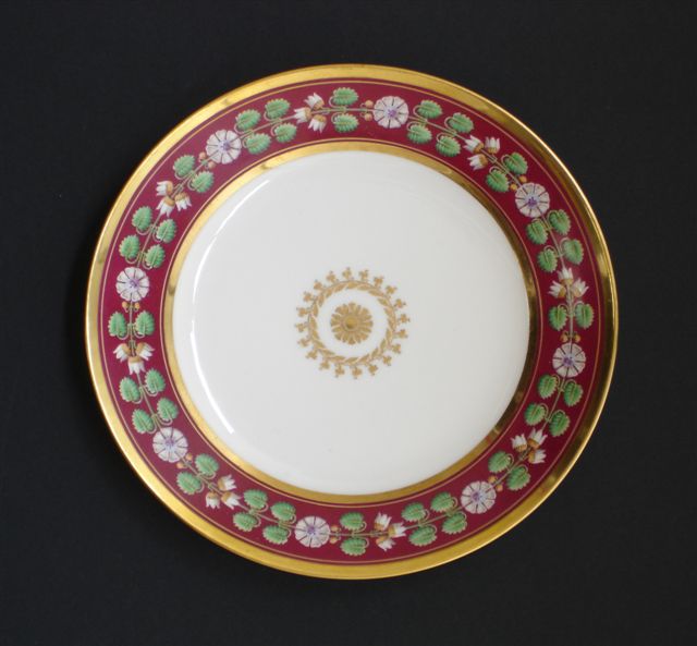 Assiettes à marli "lie de vin" orné de branches de muguet et de rosaces polychromes stylisées en alternance. Rosace en dorure au centre.