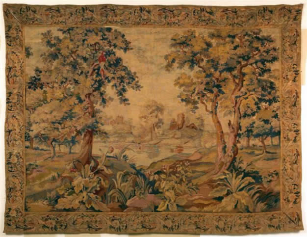 Verdure au perroquet et au geai. Au centre, une ruine se reflète dans une pièce d'eau.