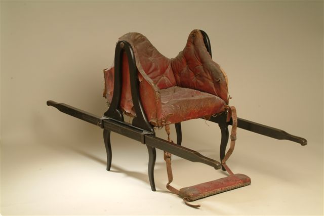 Rare FAUTEUIL à brancards, à assise mobile, montants en bois noirci en forme d'arceaux reposant sur des pieds en console. Les traverses des côtés sont munies de passants en fer pour fixer les brancards. Garniture capitonnée en marocain rouge, complétée d'un repose-pied suspendu sur le devant et maintenu par deux courroies en marocain rouge.