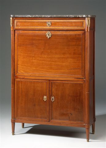 Il ouvre à un tiroir dans sa partie supérieure et deux vantaux dans sa partie inférieure. L'abattant découvre quatre cases et six tiroirs placés latéralement. Montants à cannelures rudentées. Pieds fuselés. Ornementation en bronze rapportée: entrées de serrure, chutes d'angle et sabots.